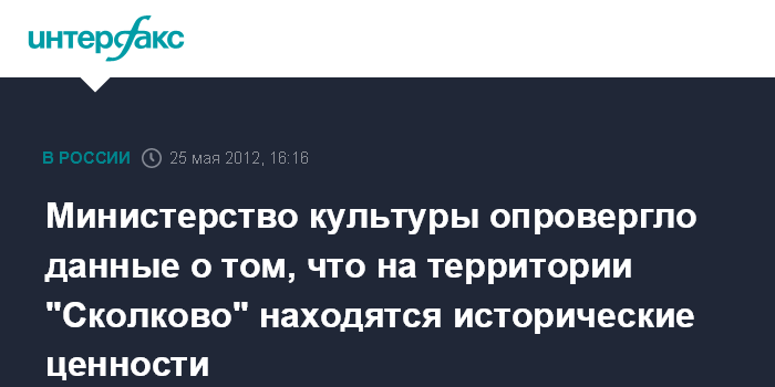 Москва. 25 мая. INTERFAX.RU - Министерство культуры опровергло информацию СМИ о конфликте с научным центром "Сколково" из-за предположительного нахождения на территории наукограда фрагментов фундамента дворца Александра Меншикова 18-го века.