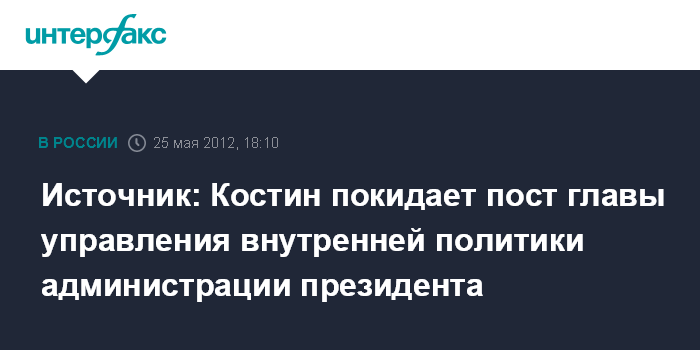 Москва. 25 мая. INTERFAX.RU - Глава управления внутренней политики администрации президента РФ Константин Костин в ближайшее время может оставить свой пост, сообщил "Интерфаксу" источник в Кремле.