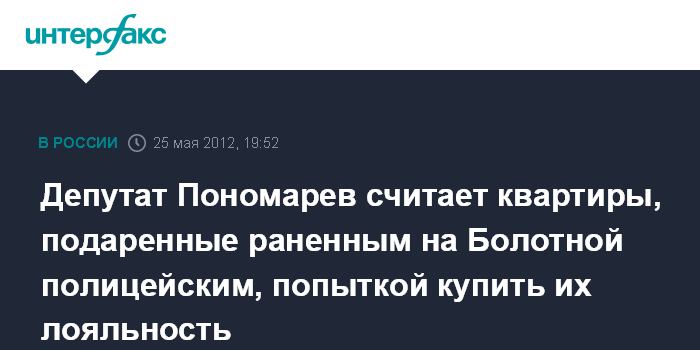 Москва. 25 мая. INTERFAX.RU - Депутат-эсер Илья Пономарев подверг критике решение о выдаче квартир сотрудникам полиции, пострадавшим 6 мая во время акции оппозиции на Болотной площади в Москве.