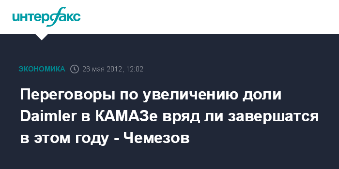 Москва. 26 мая. INTERFAX.RU - Переговоры по увеличению доли Daimler в КАМАЗе вряд ли завершатся в 2012 году, сообщил глава Ростехнологий Сергей Чемезов. "В этом году вряд ли завершатся", - сказал С.Чемезов журналистам в субботу. Как сообщалось ранее, Федеральная антимонопольная служба одобрила ходатайство Daimler на доведение его доли до блокирующего пакета.