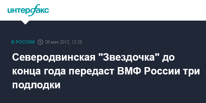 Северодвинск. 26 мая. INTERFAX.RU - ОАО "Центр судоремонта "Звездочка" до конца года передаст ВМФ России три подводные лодки, проходившие ремонт и модернизацию на верфях завода, сообщил "Интерфаксу" в субботу генеральный директор "Звездочки" Владимир Никитин. "В этом году у нас насыщенная сдаточная кампания. До конца года военно-морскому флоту будут переданы две атомные подводные лодки "Верхотурье" и "Новомосковск", а также большая дизель-электрическая подводная лодка (ДЭПЛ) "Калуга", - сказал В.Никитин.