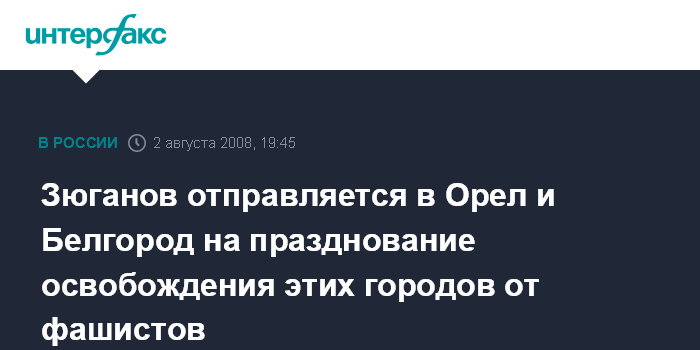 Москва. 2 августа. ИНТЕРФАКС - Лидер КПРФ Геннадий Зюганов в понедельник и вторник примет участие в торжествах по случаю 65-й годовщины освобождения от фашистских захватчиков Орла и Белгорода.