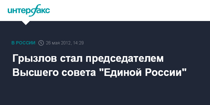 Москва. 26 мая. INTERFAX.RU - Борис Грызлов избран председателем Высшего совета "Единой России". За избрание Б.Грызлова на этот пост в субботу единогласно проголосовал съезд "Единой России". Кандидатуру Б.Грызлова предложил премьер Дмитрий Медведев, ранее на съезде избранный председателем партии.