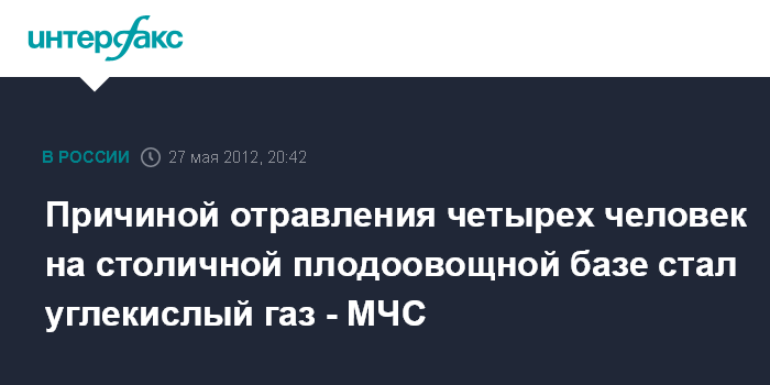 Москва. 27 мая. INTERFAX.RU - Четыре человека на плодоовощной базе отравились не фреоном, а углекислым газом, сообщили "Интерфаксу" в пресс-службе ГУ МЧС России по Москве.
