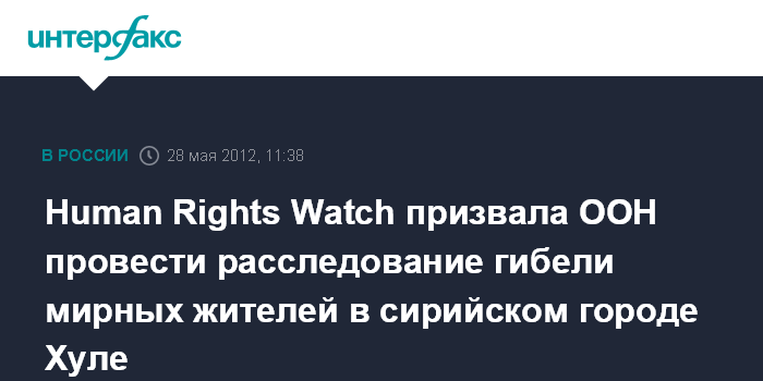 Вашингтон. 28 мая. INTERFAX.RU - Правозащитная организация Human Rights Watch в понедельник призвала ООН назначить комиссию для расследования гибели 116 мирных жителей в сирийском городе Хула.