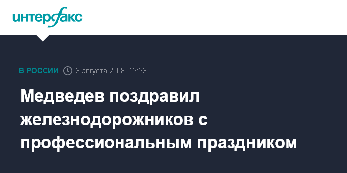 Москва. 3 июля. INTERFAX.RU - Президент России Дмитрий Медведев поздравил работников и ветеранов железнодорожного транспорта с профессиональным праздником - Днем железнодорожника, сообщили воскресенье в пресс-службе Кремля.