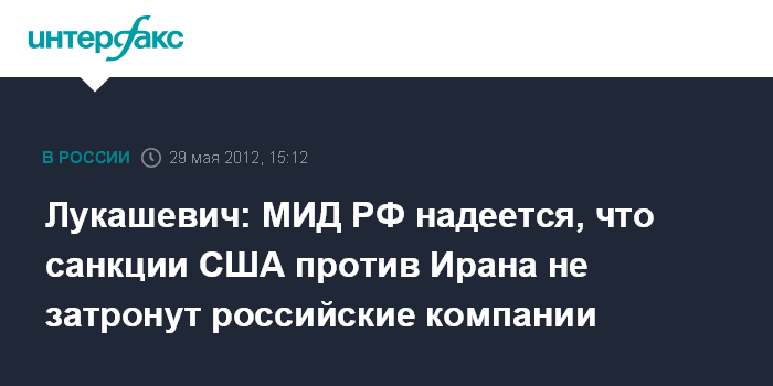 "Мы многократно и на всех уровнях заявляли о бесперспективности чрезмерного давления на Иран, только загоняющего ситуацию вокруг иранской ядерной программы в тупик, и неприемлемости распространения санкций на юридических и физических лиц из других государств", - отметил А.Лукашевич.
