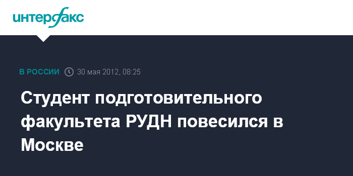Москва. 30 мая. INTERFAX.RU - Студент подготовительного факультета РУДН из Ульяновской области повесился в общежитии, сообщил "Интерфаксу" источник в правоохранительных органах Москвы.