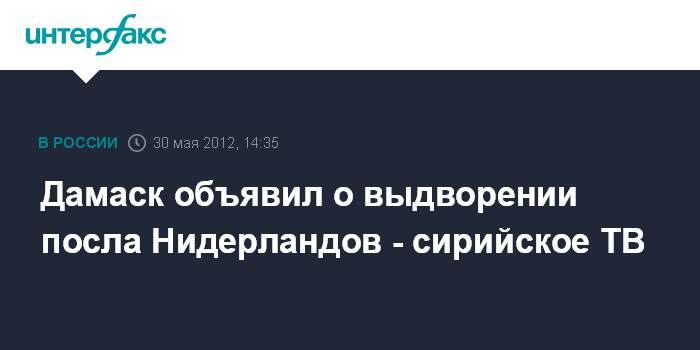 Бейрут. 30 мая. INTERFAX.RU - Сирия в среду объявила о выдворении посла Нидерландов из страны.