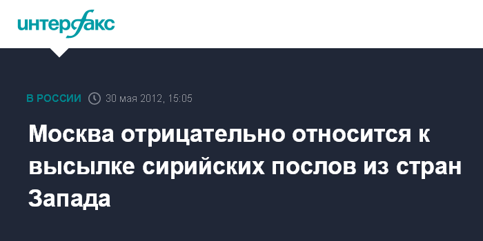 Москва. 30 мая. INTERFAX.RU - Высылка сирийских послов из ряда государств является контрпродуктивным шагом для усилий по урегулированию кризиса в Сирии, заявил официальный представитель МИД РФ Александр Лукашевич.