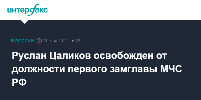 Москва. 30 мая. INTERFAX.RU - Президент России Владимир Путин своим указом освободил Руслан Цаликова от должности первого заместителя министра РФ по делам гражданской обороны, чрезвычайным ситуациям и ликвидации последствий стихийных бедствий, сообщила пресс-служба Кремля.