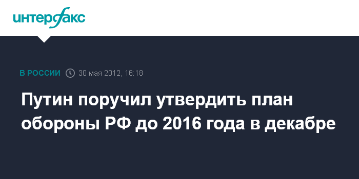 "Основные задачи и этапы такой масштабной работы - определить план обороны РФ, рассчитанной на период до 2016 года. Этот базовый документ должен быть подготовлен и утвержден в декабре текущего года", - заявил Путин на совещании с руководством Минобороны РФ.