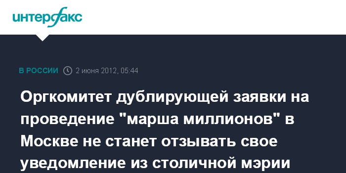 Москва. 2 июня. ИНТЕРФАКС - Оргкомитет дублирующей заявки на проведение "марша миллионов" в Москве принял решение не отзывать свое уведомление из столичной мэрии, чтобы у оппозиции было больше шансов согласовать приемлемый маршрут шествия.