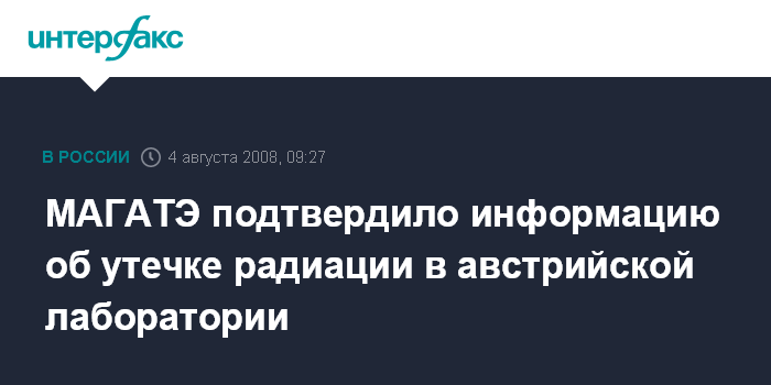 Москва. 4 августа. INTERFAX.RU - Международное агентство по атомной энергии (МАГАТЭ) подтвердило факт утечки радиации в лаборатории австрийского города Зайберсдорфа, находящегося в 45 км от Вены.