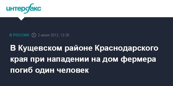 Краснодар. 2 июня. INTERFAX.RU - В Кущевском районе Краснодарского края совершено разбойное нападение на дом фермера, погиб один человек, сообщила в субботу пресс-служба прокуратуры региона. "Сегодня в 7:30 по Москве в Кущевском районе в селе Раздольное совершено разбойное нападение на дом фермера. В результате нападения один человек погиб. Нападавшие с места происшествия скрылись", - говорится в сообщении.