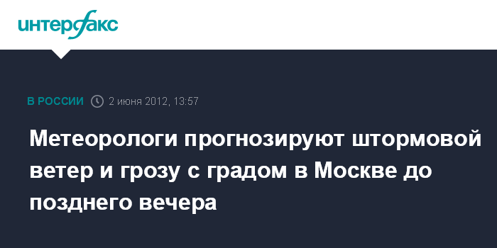 Москва. 2 июня. INTERFAX.RU - До 23.00 в Москве и в Московской области ожидаются дождь, местами сильный, ветер с порывами 15 метров в секунду и выше, сообщили "Интерфаксу" в Гидрометеобюро столичного региона. "До конца дня в субботу в городе и области возможны гроза с градом", - сказал собеседник агентства. По его словам, 2 июня воздух прогреется до 20-22 градусов, атмосферное давление составит 743 мм ртутного столба.