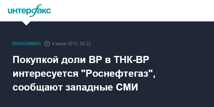 Москва. 4 июня. INTERFAX.RU - Госкомпания "Роснефтегаз" выразила заинтересованность в покупке доли BP в ТНК-BP, сообщили The Wall Street Journal и Sunday Times со ссылкой на информированные источники.
