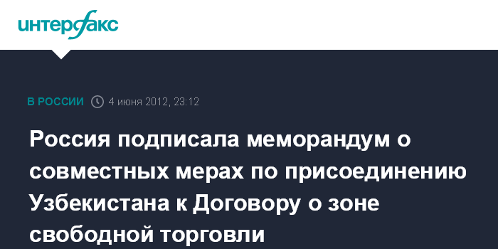 Ташкент. 4 июня. INTERFAX.RU - Лидеры России и Узбекистана Владимир Путин и Ислам Каримов подписали в Ташкенте меморандум о взаимопонимании между двумя странами о дальнейших совместных мерах по присоединению Республики Узбекистан к Договору о зоне свободной торговли в рамках СНГ.
