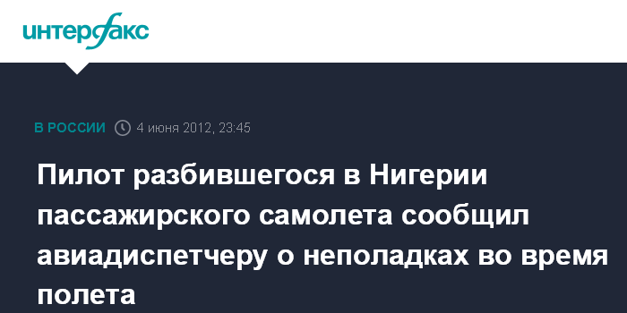 Вашингтон. 4 июня. INTERFAX.RU - Пилот разбившегося в Нигерии пассажирского самолета за несколько минут до крушения сообщил по радиосвязи о неполадках в работе самолета, сообщил в понедельник американский телеканал CNN.