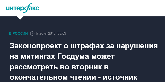 Москва. 5 июня. ИНТЕРФАКС - Законопроект, ужесточающий ответственность за нарушения при организации и проведении массовых мероприятий, может быть принят во вторник Госдумой во втором и третьем чтениях, а вступить в силу уже к 10 июня, считает источник в Кремле.