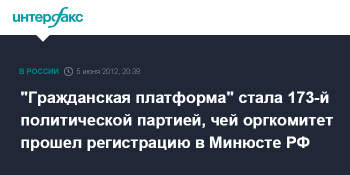 В обновленном во вторник списке сведений о "действующих" организационных комитетах политических партий, размещенном на сайте министерства, под номером 173 появилась политическая партия "Гражданская платформа". Уполномоченным лицом оргкомитета значится некто Александр Воронин.