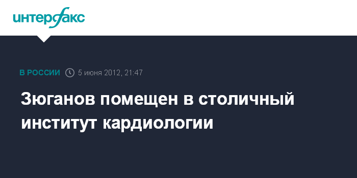 Москва. 5 июня. INTERFAX.RU - Лидер КПРФ Геннадий Зюганов по возвращении из Минеральных вод в Москву был помещен в институт кардиологии для обследования, сообщил зампред ЦК КПРФ Владимир Кашин.