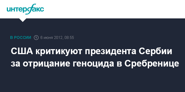 Вашингтон. 6 июня. INTERFAX.RU - Власти США сожалеют о заявлении нового президента Сербии Томислава Николича о том, что массовое убийство мусульман в Сребренице не следует считать геноцидом, заявил представитель госдепартамента США Марк Тонер.
