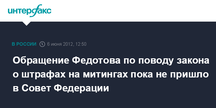 Москва. 6 июня. INTERFAX.RU - Спикер Совета Федерации Валентина Матвиенко продолжает утверждать, что до сих пор не получила обращение главы Президентского совета по правам человека Михаила Федотова, который призывал ее, как председателя, и в целом палату не одобрять резонансный закон о митингах.