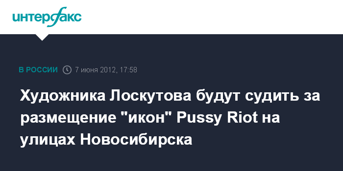Новосибирск. 7 июня. INTERFAX.RU - Новосибирский художник, организатор ежегодных Монстраций Артем Лоскутов привлечен к административной ответственности за появление в Новосибирске стилизованных под иконы изображений участниц панк-группы Pussy Riot.