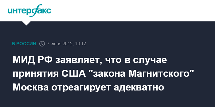 МИД РФ заявляет, что в случае принятия США "закона Магнитского" Москва отреагирует адекватно