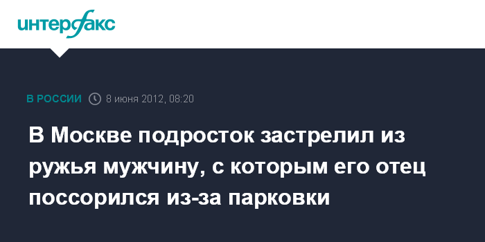 Москва. 8 июня. INTERFAX.RU - Подросток застрелил из ружья мужчину, с которым его отец вступил конфликт на парковке на юго-востоке Москвы, сообщил "Интерфаксу" источник в правоохранительных органах.