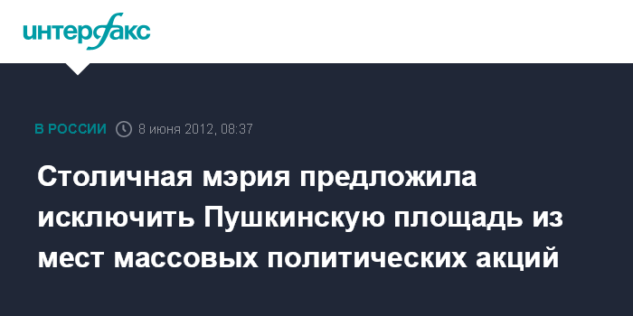 Москва. 8 июня. INTERFAX.RU - В мэрии Москвы предлагают запретить проводить политические акции на Пушкинской площади.