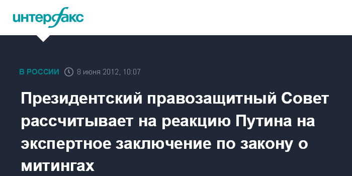 Москва. 8 июня. INTERFAX.RU - Глава президентского Совета по правам человека Михаил Федотов рассчитывает на то, что президент Владимир Путин отреагирует на экспертное заключение рабочей группы Совета на закон об ужесточении наказания за нарушения на митингах.