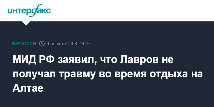 Москва. 4 августа. INTERFAX.RU – МИД России опровергает сообщения о том, что министр иностранных дел РФ Сергей Лавров якобы получил травму во время отдыха на Горном Алтае и был госпитализирован.