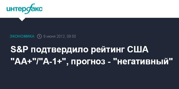 Нью-Йорк. 9 июня. INTERFAX.RU - Служба кредитных рейтингов Standard & Poor's подтвердила суверенные рейтинги США на уровне "AA+"/"A-1+", но оставила прогноз "негативным" из-за политических и бюджетных рисков, говорится в сообщении агентства.