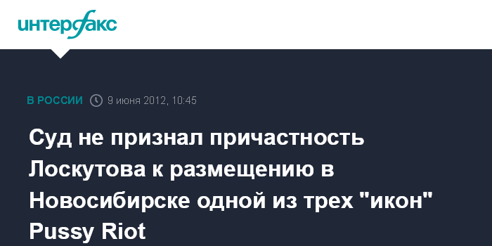 Новосибирск. 9 июня. INTERFAX.RU - Мировой суд Железнодорожного района в субботу оправдал новосибирского художника, организатора ежегодных Монстраций Артема Лоскутова по делу о размещении в Новосибирске одного из трех стилизованных под иконы изображений участниц панк-группы Pussy Riot. "Я оправдан ввиду недостаточности доказательств", - сообщил А.Лоскутов агентству "Интерфакс-Сибирь".