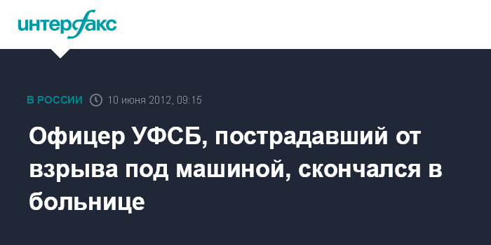 Нальчик. 10 июня. ИНТЕРФАКС-ЮГ - Офицер УФСБ по Кабардино-Балкарии, раненый в ночь на воскресенье в результате подрыва автомобиля в городе Баксане, скончался в больнице, сообщил в воскресенье агентству "Интерфакс-Юг" официальный представитель оперативного штаба в КБР.