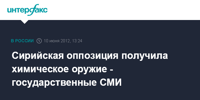 Тегеран. 10 июня. INTERFAX.RU - Сирийские оппозиционеры обладают химическим оружием и намерены применить его в отношении мирных граждан, чтобы затем обвинить в этом Дамаск, сообщило в воскресенье иранское агентство ФАРС со ссылкой на официальные сирийские СМИ.