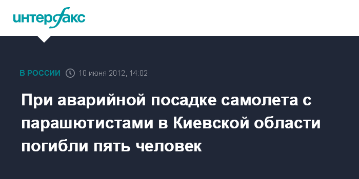 Киев. 10 июня. INTERFAX.RU - Пять человек погибли и 13 пострадали при аварийной посадке самолета с парашютистами возле Бородянки в Киевской области.