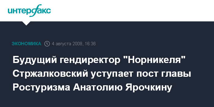 Будущий гендиректор "Норникеля" Стржалковский уступает пост главы Ростуризма Анатолию Ярочкину