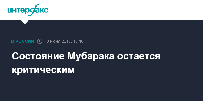 Каир. 10 июня. INTERFAX.RU - Экс-президент Египта Хосни Мубарак восьмой день подряд находится в критическом состоянии, сообщают в воскресенье местные СМИ со ссылкой на источник в правоохранительных органах Египта.