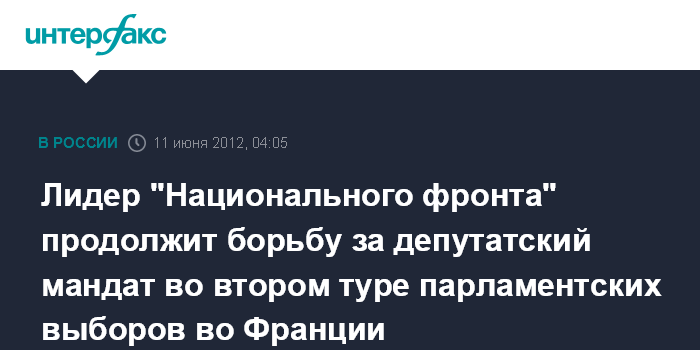 М.Ле Пен баллотировалась в 11-м округе департамента Па-де-Кале, как и ее главный политический противник, не прошедший во второй тур выборов в Национальное собрание Франции, лидер радикального "Левого фронта" Жан-Люк Меланшон.