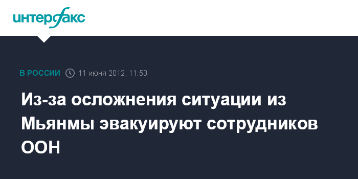 Нью-Йорк (ООН). 11 июня. INTERFAX.RU - ООН в понедельник объявила о начале вывода персонала из Мьянмы (Бирмы) в связи с осложнением ситуации в стране, что привело к введению на части территории страны режима чрезвычайного положения. Пока эвакуация проводится на добровольной основе.