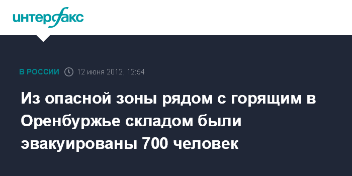 Оренбург. 12 июня. ИНТЕРФАКС - Управление МВД по Оренбургской области сообщает о 700 эвакуированных из поселков рядом с горящим складом.