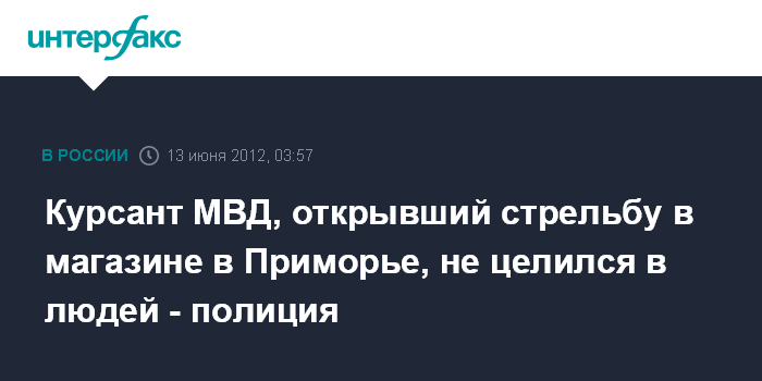 "Курсант Михаил Коломеец выстрелил в воздух, по людям он не стрелял", - сообщила в среду агентству "Интерфакс-Дальний Восток" начальник пресс-службы краевого УМВД Ирина Сырова.