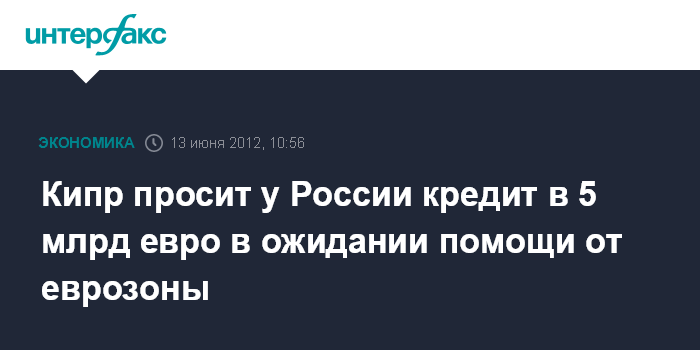 Москва. 13 июня. INTERFAX.RU - Власти Кипра обратились к России за двусторонним кредитом на 5 млрд евро, что составляет более четверти ВВП острова, в ожидании помощи от еврозоны, пишет кипрская газета Alithia.