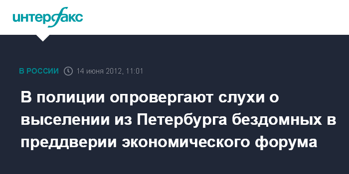 Санкт-Петербург. 14 июня. INTERFAX.RU - Начальник ГУ МВД по Петербургу и Ленинградской области Сергей Умнов опроверг слухи о принудительном выселении бездомных в преддверии Международного экономического форума.