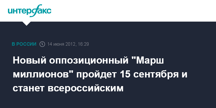 Москва. 14 июня. INTERFAX.RU - Оппозиция приняла решение провести следующую массовую акцию "Марш миллионов" в середине сентября по всей России, сообщил лидер "Левого фронта" Сергей Удальцов.