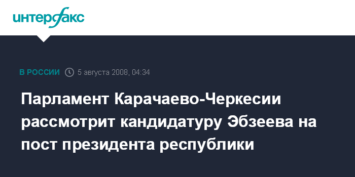 30 июля президент России Дмитрий Медведев внес на рассмотрение Народного Собрания Карачаево-Черкесской республики кандидатуру Бориса Эбзеева для наделения его полномочиями президента КЧР.