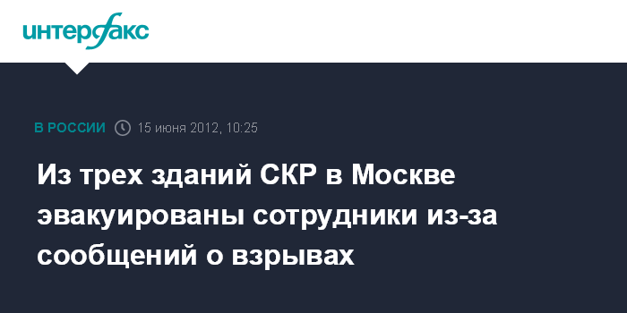 Москва. 15 июня. INTERFAX.RU - Сотрудники сразу трех зданий Следственного комитета, расположенных в Москве, эвакуированы в связи с поступившими телефонными сообщениями о заложенных взрывных устройствах, сообщил официальный представитель СК РФ Владимир Маркин.